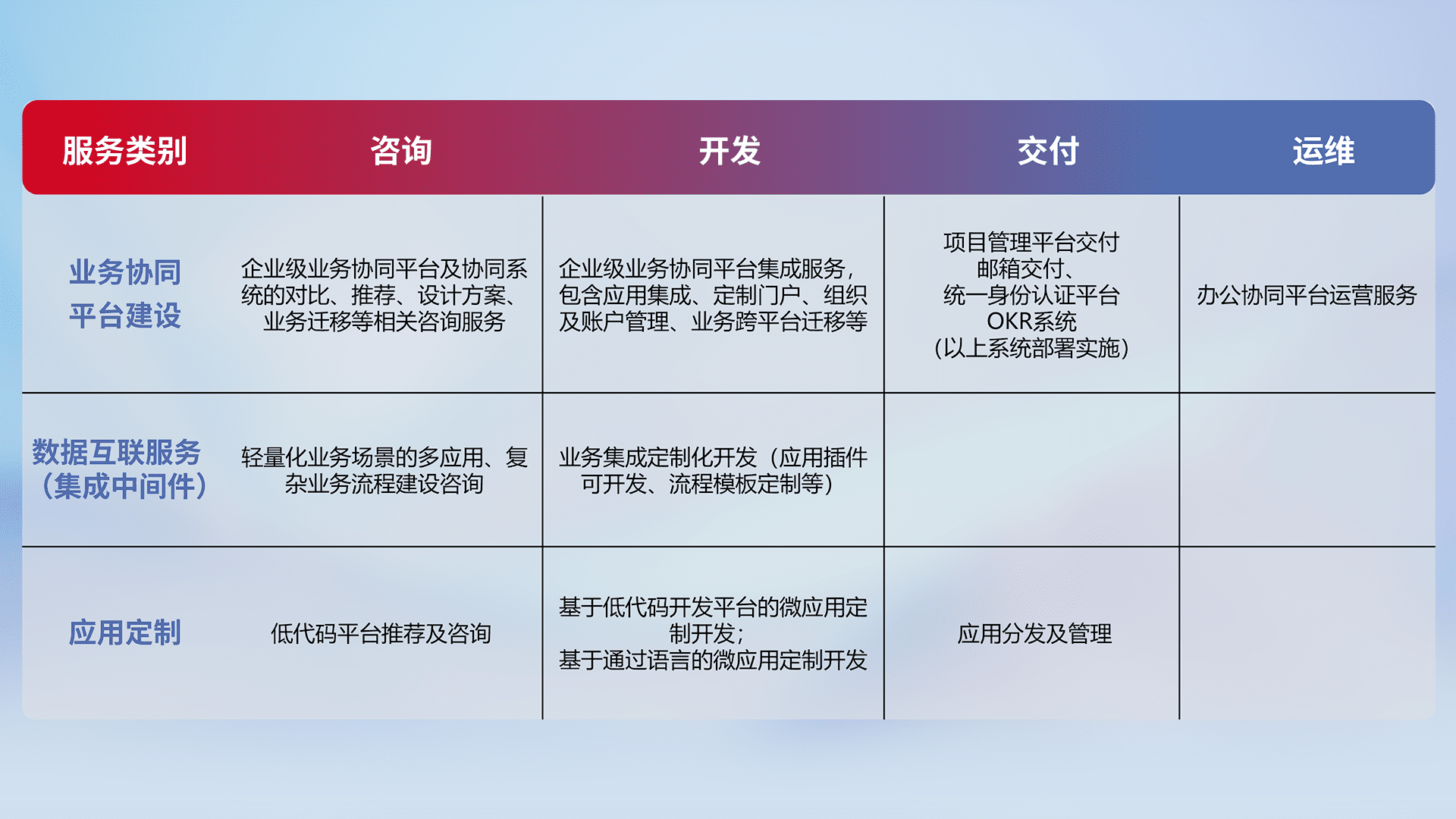 针对钉钉、、、企微、、IDaas等平台级产品提供产品的规划、、方案、、、交付、、、、定制化开发等服务,,实现如统一协同办公、、智能客户服务、、、、混合会议管理、、、、智能数据查询、、、等业务场景,,实现数字化转型。。